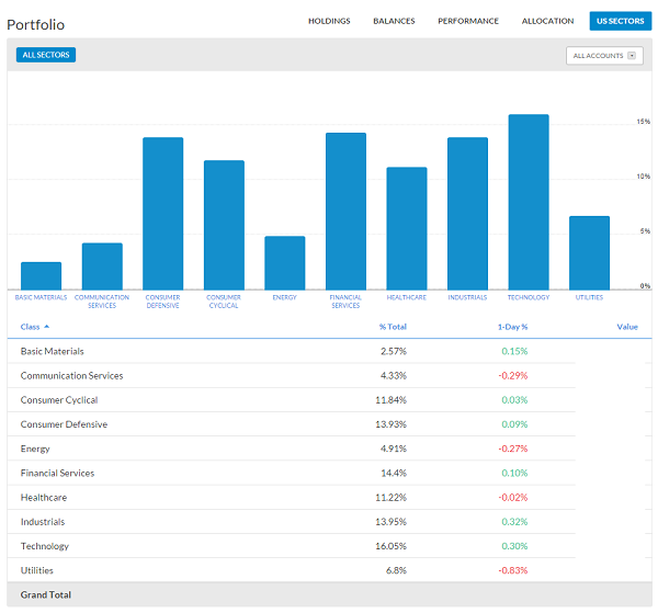 It's hard to see your asset allocation across brokerage accounts. But at a glance I know I'm 65.61% in U.S. stocks and 12.5% in U.S. bonds.