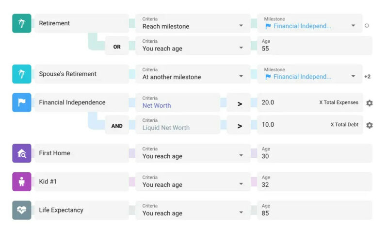 Plans in ProjectionLab are centered around milestones. These are your big picture goals, events, and phases of life. There are some defaults you can use as a starting point, but milestones are flexible and customizable. It’s a good idea to spend a little time thinking about the key events and transitions you want to plan for.