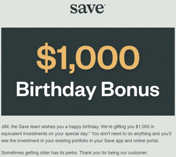 My birthday has just passed and it turns out that Save gives a Birthday Bonus! A nice little bonus.