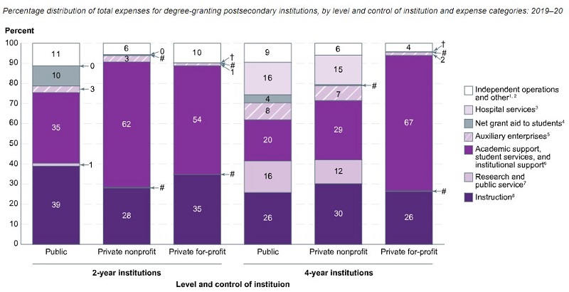 At private 4-year for-profit universities, 67% of total expenses goes towards “Academic support, student services, and institutional support.” Only 26% goes towards instruction. Even at private nonprofits, it’s 29% (instruction is 30%).