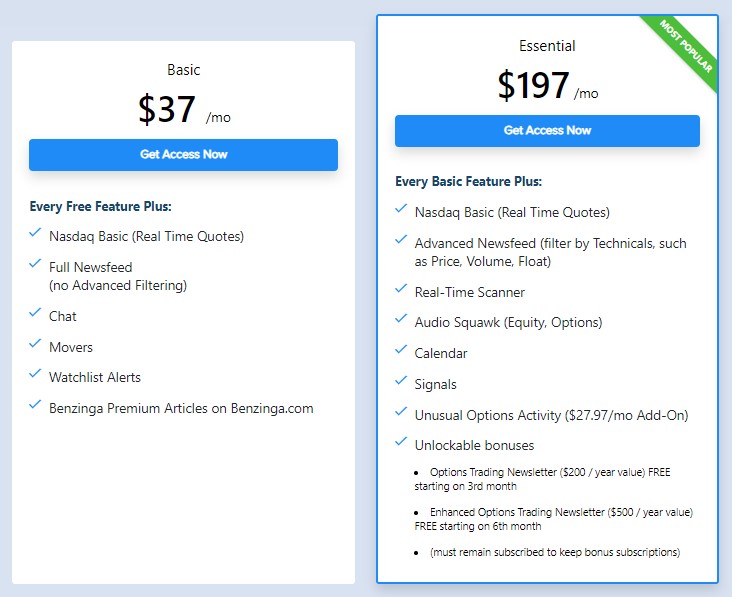 Benzinga Pro is available at two different pricing levels. Here’s a closer look at their plans: