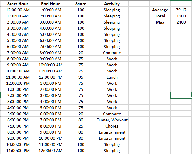 I threw up that spreadsheet and those numbers in about five minutes to give people an idea of what I was talking about. My day to day (and I suspect yours too) isn’t as rigid as “Sleep from 10PM to 7AM” and a commute from 7-8AM and 5-6PM… so that’s how you should view the table. Rather than analyze the specifics of the table, which would be for me anyway, create your own and see how you can improve it. It’s not about how people score but about your score and how you can improve it.