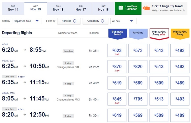 For example, I checked some flights from BWI (Baltimore) to LAS (Las Vegas) and they looked like this: