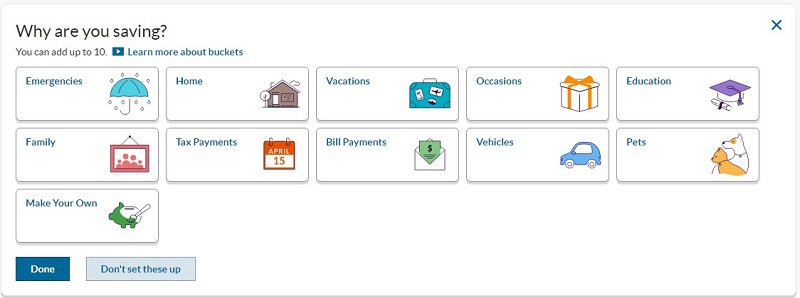 Ally Bank recently added a new feature to their savings accounts – “buckets.” Buckets are ways to organize your savings without having to create separate savings accounts. There are ten pre-made buckets (Emergencies, Home, Vacations, Occasions, Education, Family, Tax Payments, Bill Payments, Vehicles, Pets) and a “Make Your Own”. When you pick the ones you want, you’ll get those plus one called “Core Savings.”