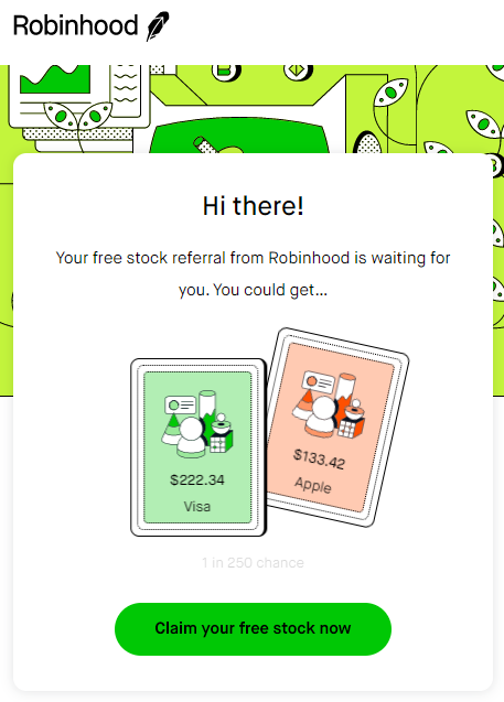 When you join Robinhood with a referral, you get a chance of getting a share of stock valued between $5 – $200. The stock is awarded when you link a bank account.