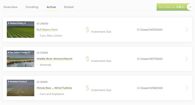 AcreTrader is the platform I’m most familiar with, having invested in parts of three farms, and they allow you buy acres of farmland with relatively low minimums. My first investment was in an Illinois Row Crop Farm with a Wind Turbine – the minimum investment was 5 shares ($4,750.50) with a 9.2% net annual return (what they call net internal rate of return, IRR). One actually failed; you can read about how that worked here.
