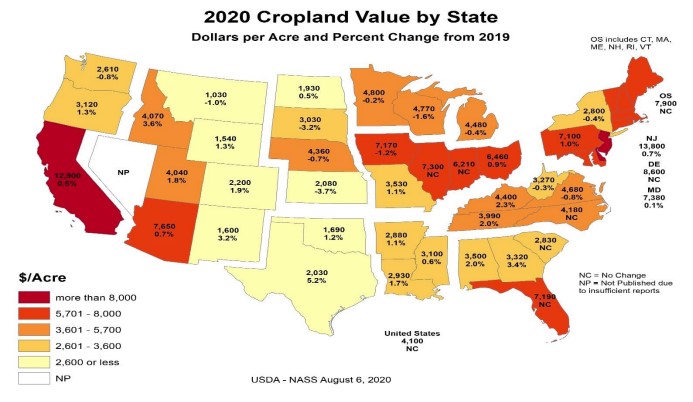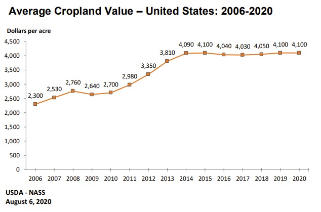 The value of cropland, which is the land on which the crops are grown, is slightly higher at $4,100 per acre: