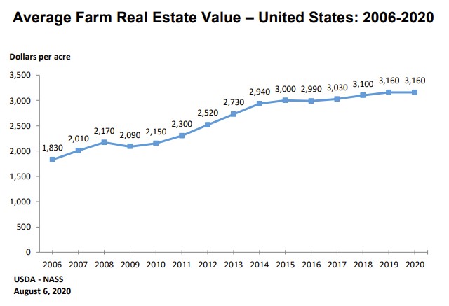 The USDA publishes land value reports on a regular basis and the latest one I saw, from August 2020, shows that an acre of farmland (the entire property) is worth approximately $3,160 in 2020 (no change from 2019):