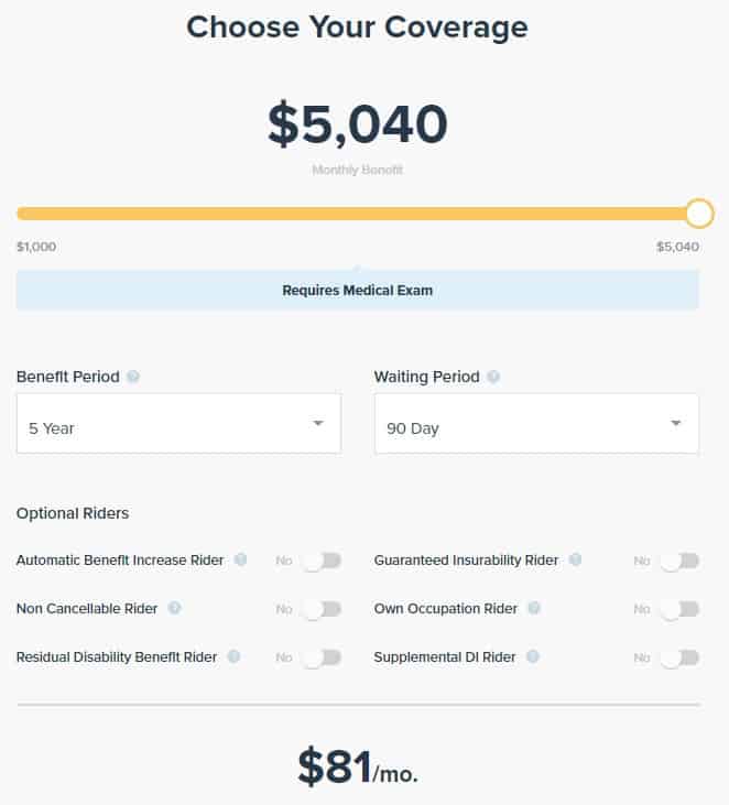 You can also play with the benefit period and waiting period. I was surprised to see the quote jump from $81/mo to $177/mo when I lowered the waiting period to 30 days. This does make sense because now you include all those short term injuries, like a broken bone, that could fully heal within 90 days. Increasing the benefit period to age 65 only upped the premium to $123 a month.
