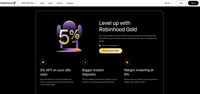 Robinhood offers an optional monthly subscription called Robinhood Gold that unlocks several premium benefits for $50 a year (or $5 per month when paid monthly) after a 30-day free trial.