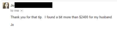 A reader, Jo, found $2,400 in her husband’s name! She thinks it’s an old bank account.