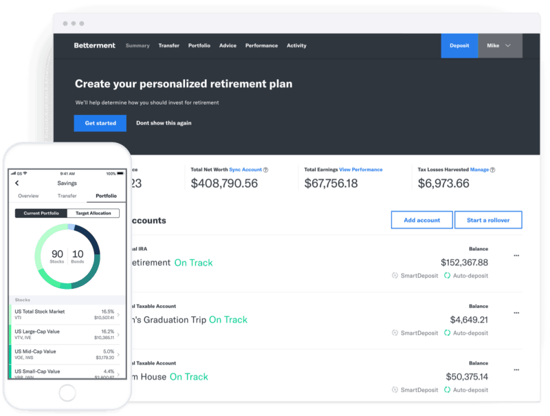 Betterment will project your retirement income, analyze your non-Betterment accounts, and provide a plan to help you reach your goal. You’ll then be able to track your progress to see how close you are to reaching your retirement goal.