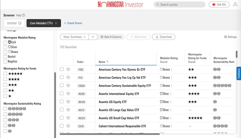 Morningstar Investor members can also access the utilitarian screener to find stock, ETF, and mutual fund ratings. The ratings filters include the Morningstar Medalist ratings, star ratings, and sustainability ratings.