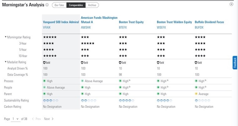 Each fund summary includes Morningstar analysis of the five pillars: