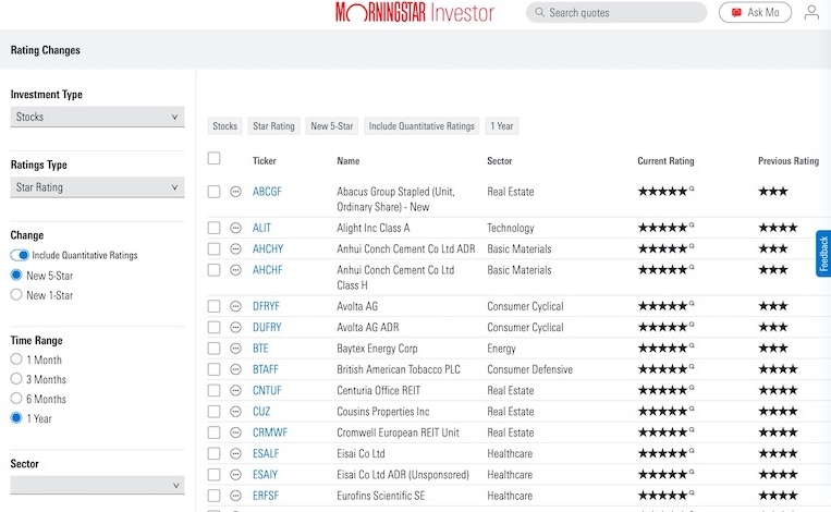 The Morningstar platform also publishes numerous free and premium articles which highlight the highest-rated stocks and funds.