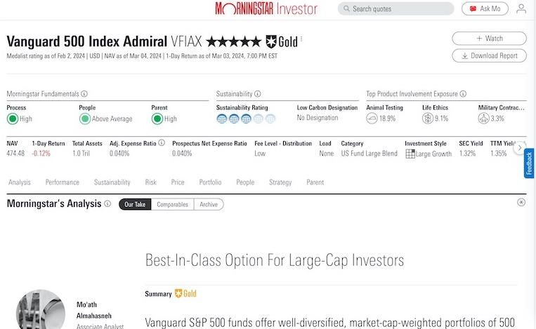I took a look at the report for the Vanguard 500 Index Admiral Shares (VFIAX), which got 5 stars and a Gold rating as of March 4th, 2024. Remember, one of the rating criteria is Price and this report is based on the March 4th, 2024 price.