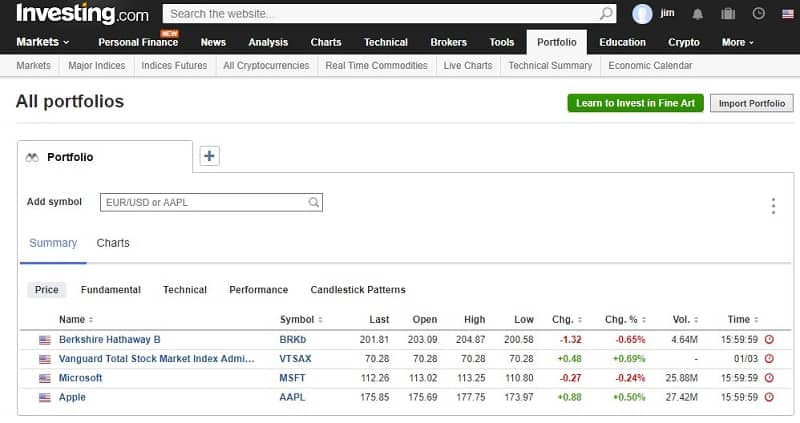 The platform provides streaming quotes, technical data, extensive chart capabilities, and financial news and analysis. It differs from other investment platforms on this list in that the homepage is dedicated primarily to market results and financial data. To get financial news, you need to access the News drop-down tab. You can set personal portfolio preferences on the Portfolio tab.