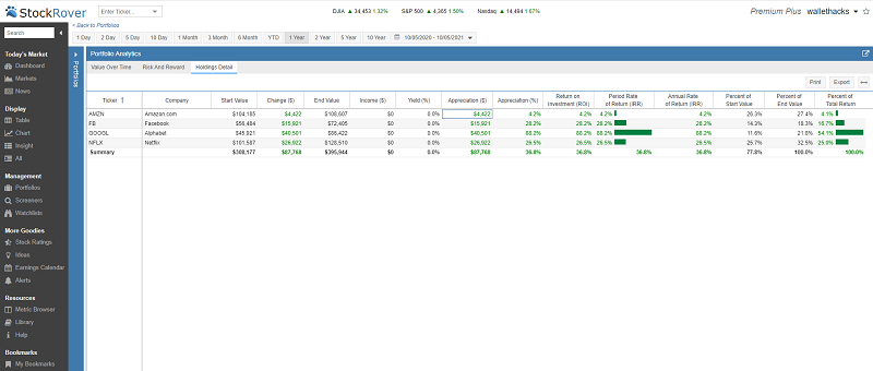 Stock Rover has a wealth of portfolio analysis tools that allow you analyze your own portfolios or sample ones you create on your own. Much like Portfolio Visualizer, which we share below, it has a lot of features that can be a bit overwhelming when you first fire it up. If you get used to it though, they will serve you quite well in terms of analysis.