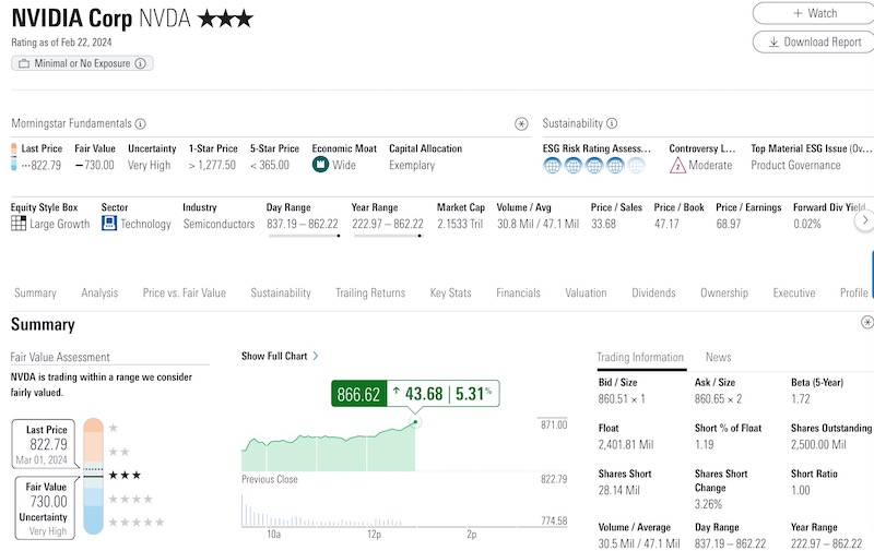 If you noticed, Nvidia has just three stars at the time of this write-up. This is not an indictment of the company but of its valuation. For each stock, they calculate a Fair Value (3 stars), and they’ve determined that Nvidia is near its fair value assessment—thus, it’s just a three-star stock pick. With Investor, you also get a star rating, economic moat, stewardship grade, and fair value uncertainty.
