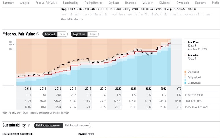 The Business and Strategy Outlook, dated February 21st, 2024, is also written by Colello, but it puts everything in context so you can understand the why behind a company. Why does Nvidia do well? “Nvidia has a wide economic moat, thanks to its market leadership in graphics processing units, or GPUs, hardware and software tools needed to enable the exponentially growing market around artificial intelligence. In the long run, we expect tech titans to strive to find second-sources or in-house solutions to diversify away from Nvidia in AI, but most likely, these efforts will chip away at, but not supplant, Nvidia’s AI dominance.”